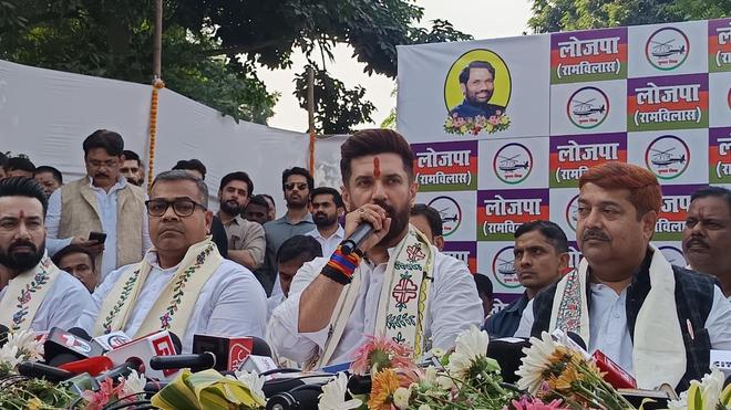 लोजपा (आरवी) नेता चिराग पासवान नवनिर्वाचित विधायकों के साथ 15 नवंबर, 2025 को पटना स्थित पार्टी कार्यालय में मीडिया को संबोधित करते हुए। |